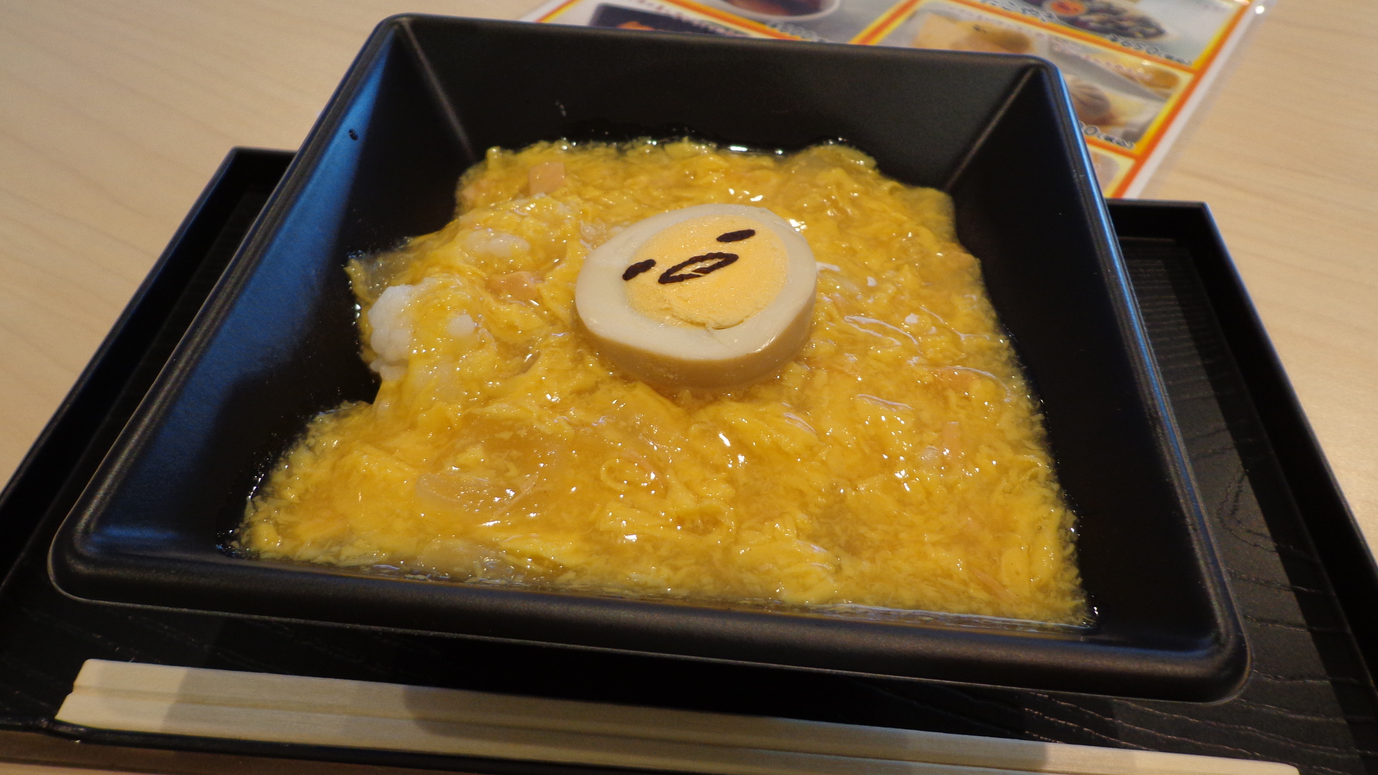 This is Gudedon, which is Gudetama on Oyakodon. When you order this, you can choose either with chicken in or without chicken.